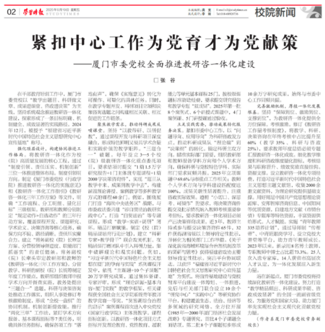 习近平总书记指出,党校作为党的思想理论战线的重要方面军,承担着为党献策的重要职责;这也是党校不同于一般学校的独特价值所在。厦门坚决扛起为党献策的重大责任,充分发挥独特资源优势,以教研咨一体化为抓手,努力在研究阐释宣传党的创新理论、服务科学决策方面推出更多高质量成果。相关做法作为基层党校唯一范例在今年全国党校工作会议前夕被新华社刊文报道。