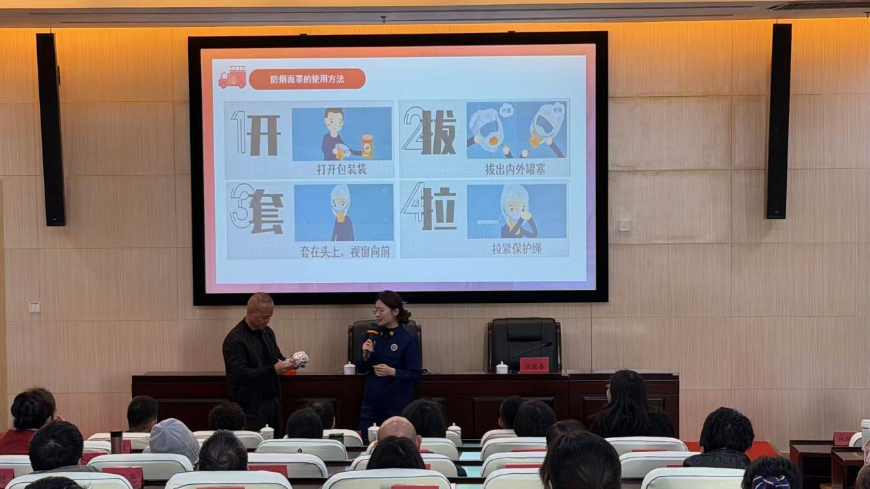 培训会上,黄思远宣讲员结合多年消防宣教经验,以近年来典型火灾事故案例为切入点,围绕“安全用火用电”主题,深入讲解火灾预防、隐患排查、初期火灾扑救、火场疏散逃生等关键知识。并通过现场演示,详细介绍灭火器、防烟面罩等消防器材的正确使用方法,让参训人员直观掌握应急处置技巧。