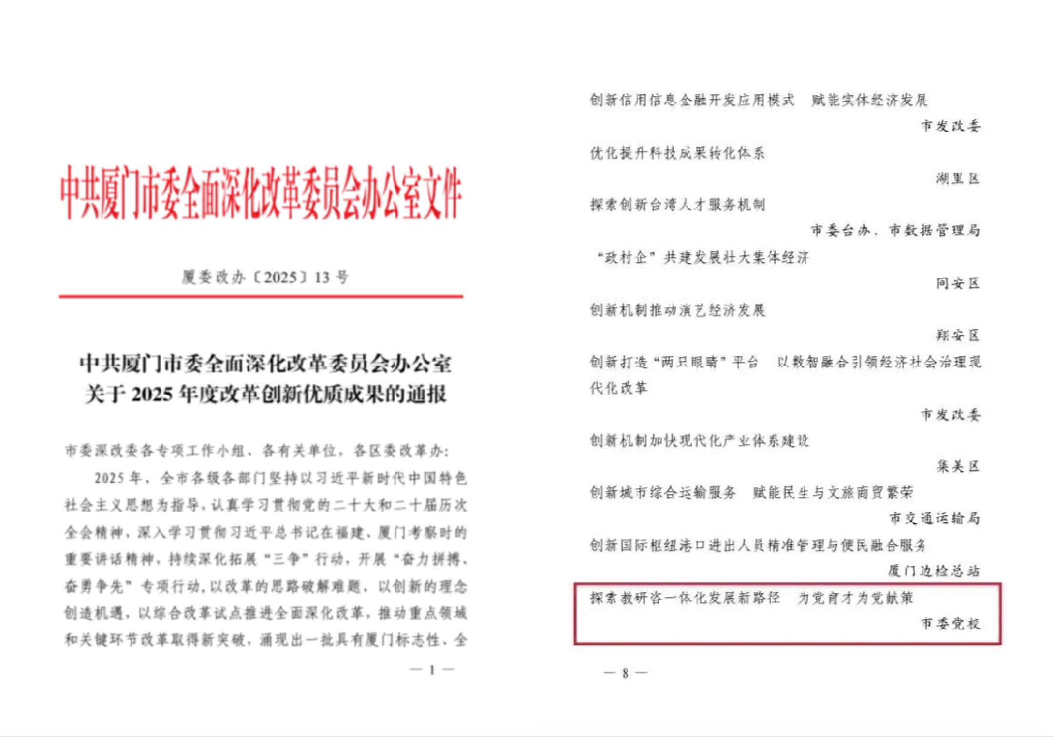日前,中共厦门市委全面深化改革委员会公布了2025年度改革创新优质成果的通报,厦门市委党校创新案例《探索教研咨一体化发展新路径 为党育才为党献策》获评“改革创新优秀案例”!