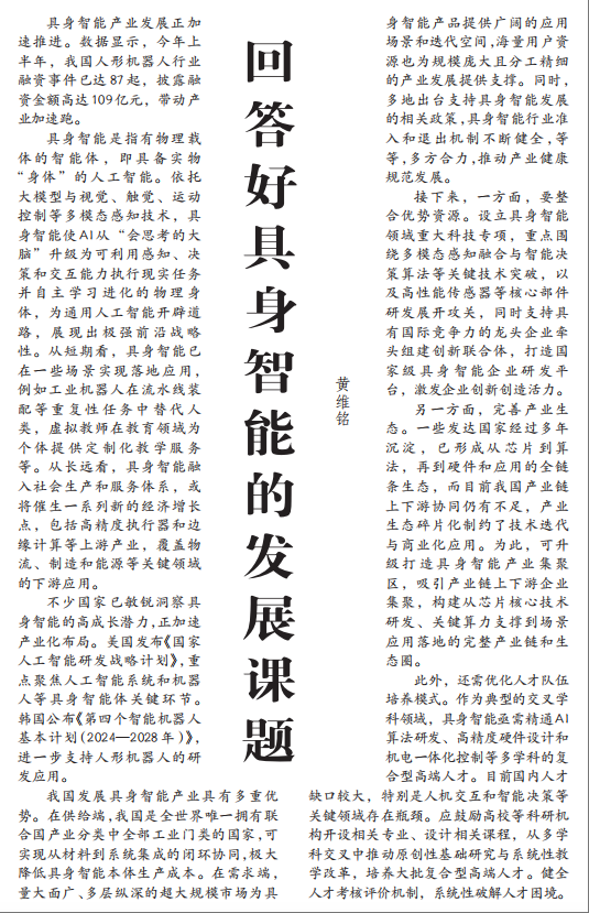 我校(院)哲学与文化教研部黄维铭讲师的理论文章《回答好具身智能的发展课题》于2025年12月19日在《经济日报》刊发。