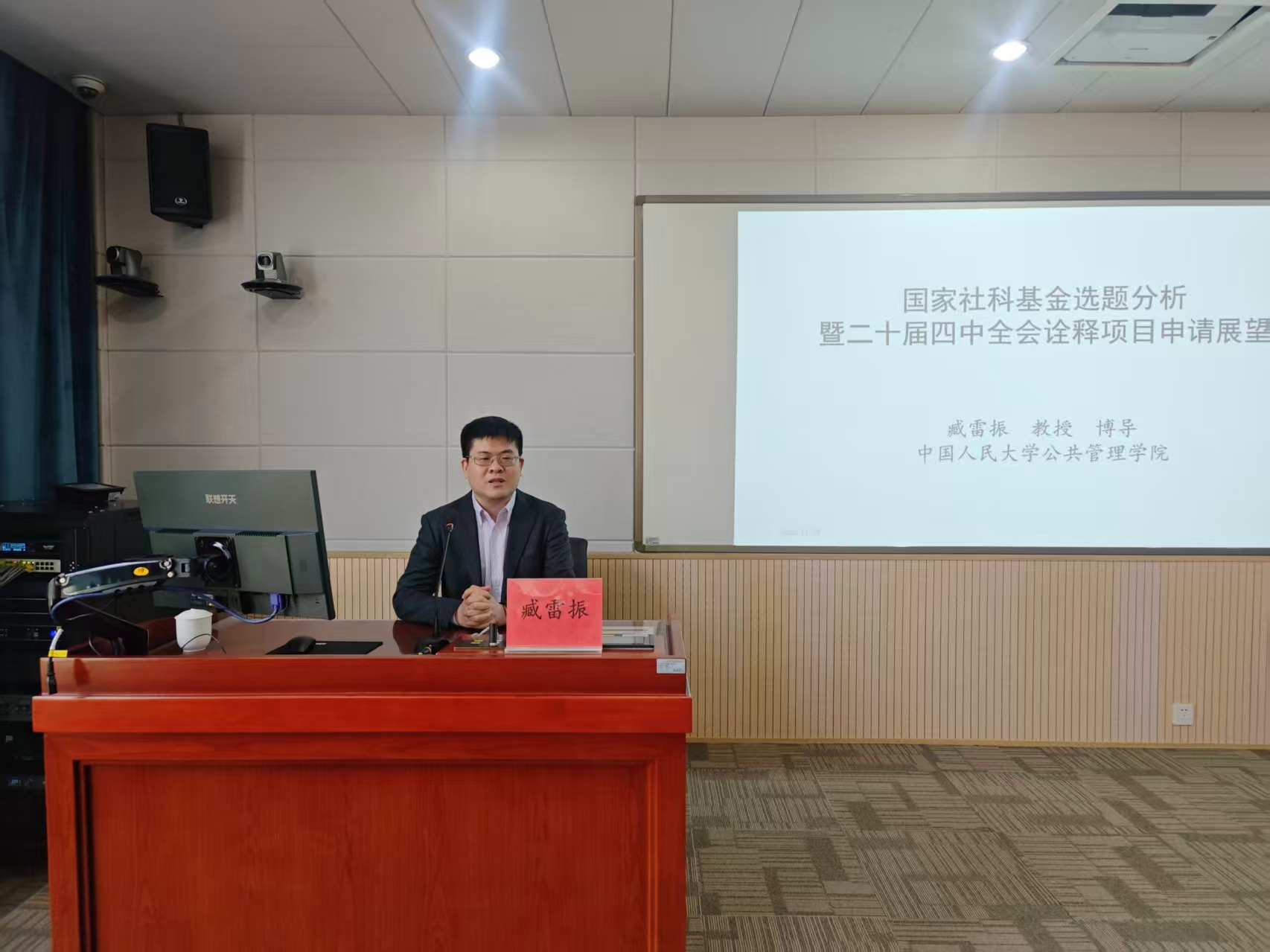 为扎实推进我校(院)2026年度国家社会科学基金项目申报工作,助力青年教师提升教学、科研与资政综合能力,11月27日,我校(院)在305教室举行“国家社科基金选题分析暨二十届四中全会诠释项目申请展望”专题培训。本次培训邀请中国人民大学公共管理学院臧雷振教授主讲,副校(院)长王刚主持,全体青年教师参加学习。