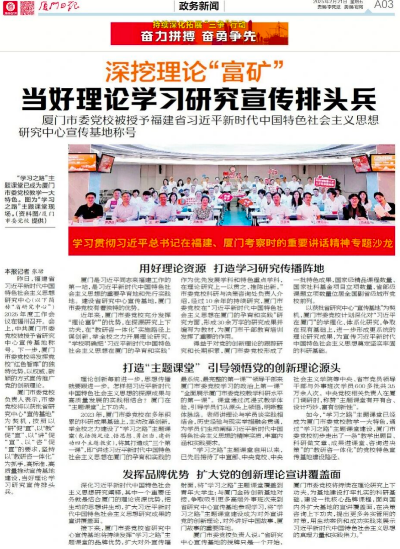 二、坚持教研相长,深化研究阐释宣传。研究阐释宣传党的创新理论,是为党献策的重大任务。以获评省新思想研究中心宣传基地为契机,推动研究阐释宣传体系化、学理化。一是深挖理论富矿。系统梳理新思想在厦门孕育发展脉络,挖掘《1985年—2000年厦门经济社会发展战略》蕴含的独特价值,形成30余万字研究成果,发表理论文章180多篇,努力研深研透源头起点、逻辑内核、地方实践。二是打造精品课程。开发“习近平在厦门”等理论课程56门,录制微视频71个,以更富现场感的课程把党的创新理论讲鲜活、讲彻底。“厦门实践”筼筜湖综合治理被纳入中央党校课程。三是展示思想伟力。用好“学习之路”等平台载体,宣传宣讲总书记对厦门殷切关怀、指路领航取得的显著成效。发挥厦门外事培训多、对外联系多的优势,讲好党的创新理论在福建、厦门的实践故事。