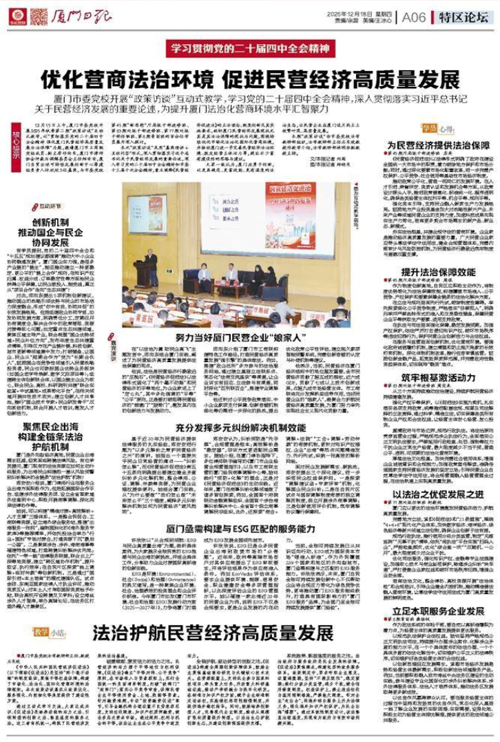 大家一致认为,厦门应勇于创新,以更具规范、更富效能、更有温度的法治生态,让民营企业在厦门这片热土上枝繁叶茂、高质量发展。