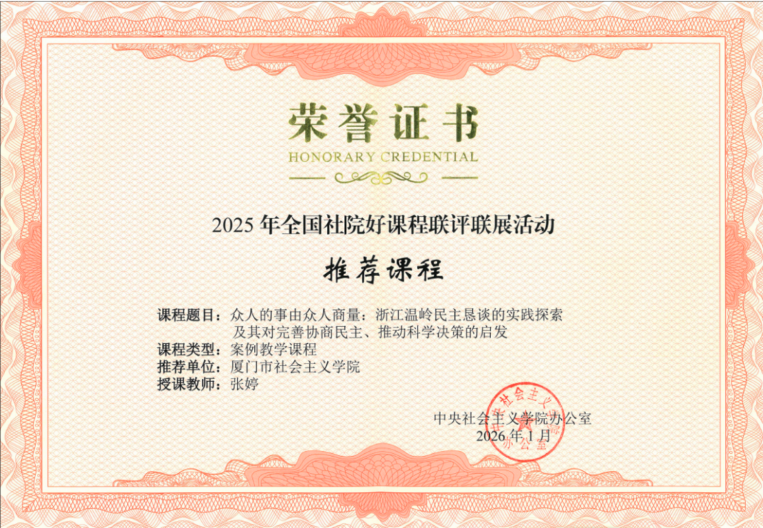 由张婷老师主讲的《众人的事由众人商量:浙江温岭民主恳谈的实践探索及其对完善协商民主、推动科学决策的启发》获评“推荐课程”。