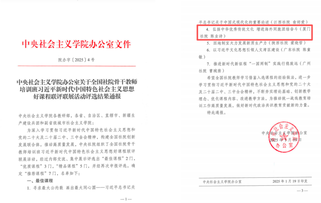 此前,校(院)青年教师陈业诗主讲的《弘扬中华优秀传统文化 增进海外同胞团结奋斗》在中央社院组织的全国社院骨干老师培训班习近平新时代中国特色社会主义思想好课程联评联展活动中获评“推荐课程”。